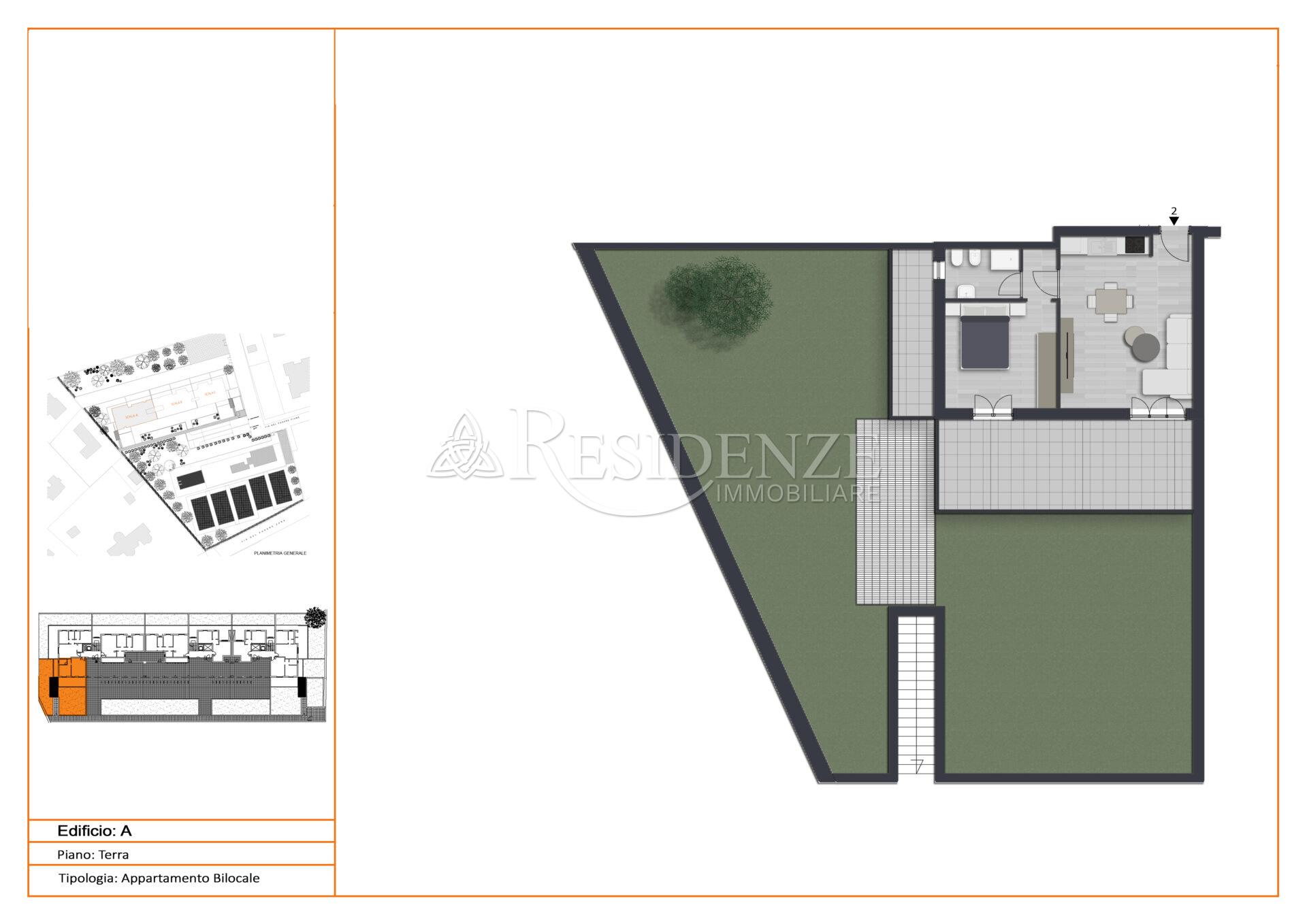 Appartamento bilocale posto al piano terra di 48 mq composto da soggiorno con angolo cottura, camera da letto, bagno, giardino di 188 mq. e portico di 38 mq. Completa la proprietà una cantina. Superficie commerciale complessiva di 78 mq.