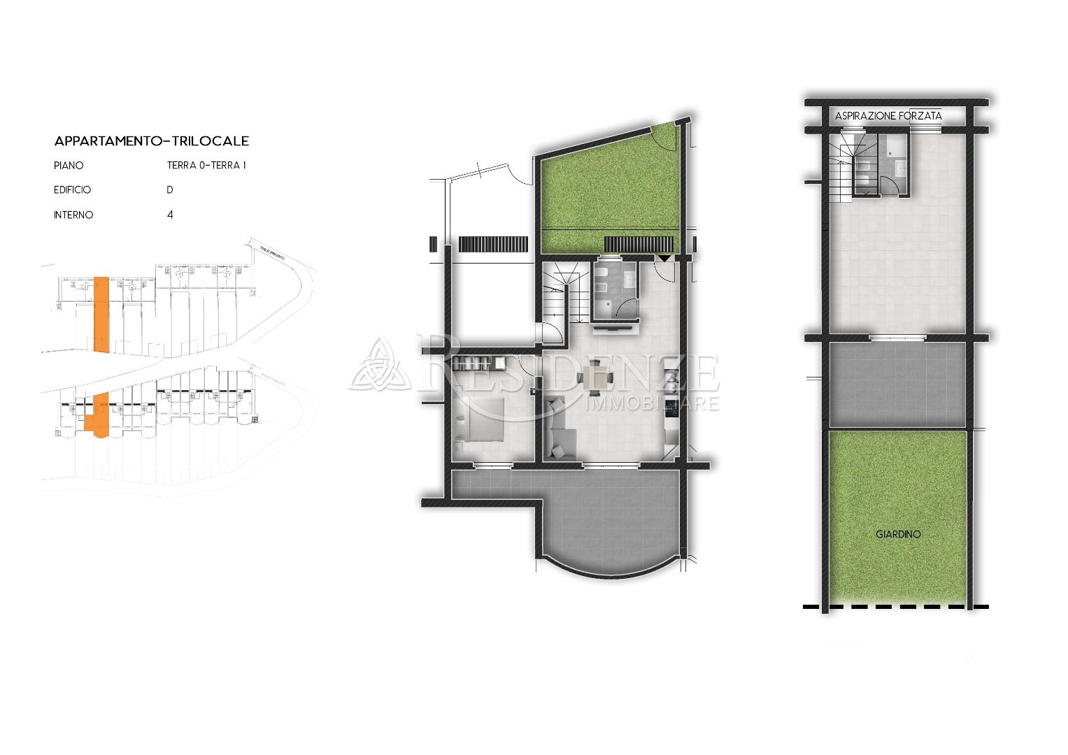 Appartamento trilocale bilivello di 114 mq coperto posto al piano terra con soggiorno con angolo cottura, camera, bagno, giardino di 110 mq. con portico di 35 mq. e posto auto;