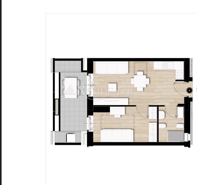 Appartamento bilocale di 44 mq posto al piano attico composto da salone con angolo cottura, camera da letto, bagno e terrazzo di 16 mq