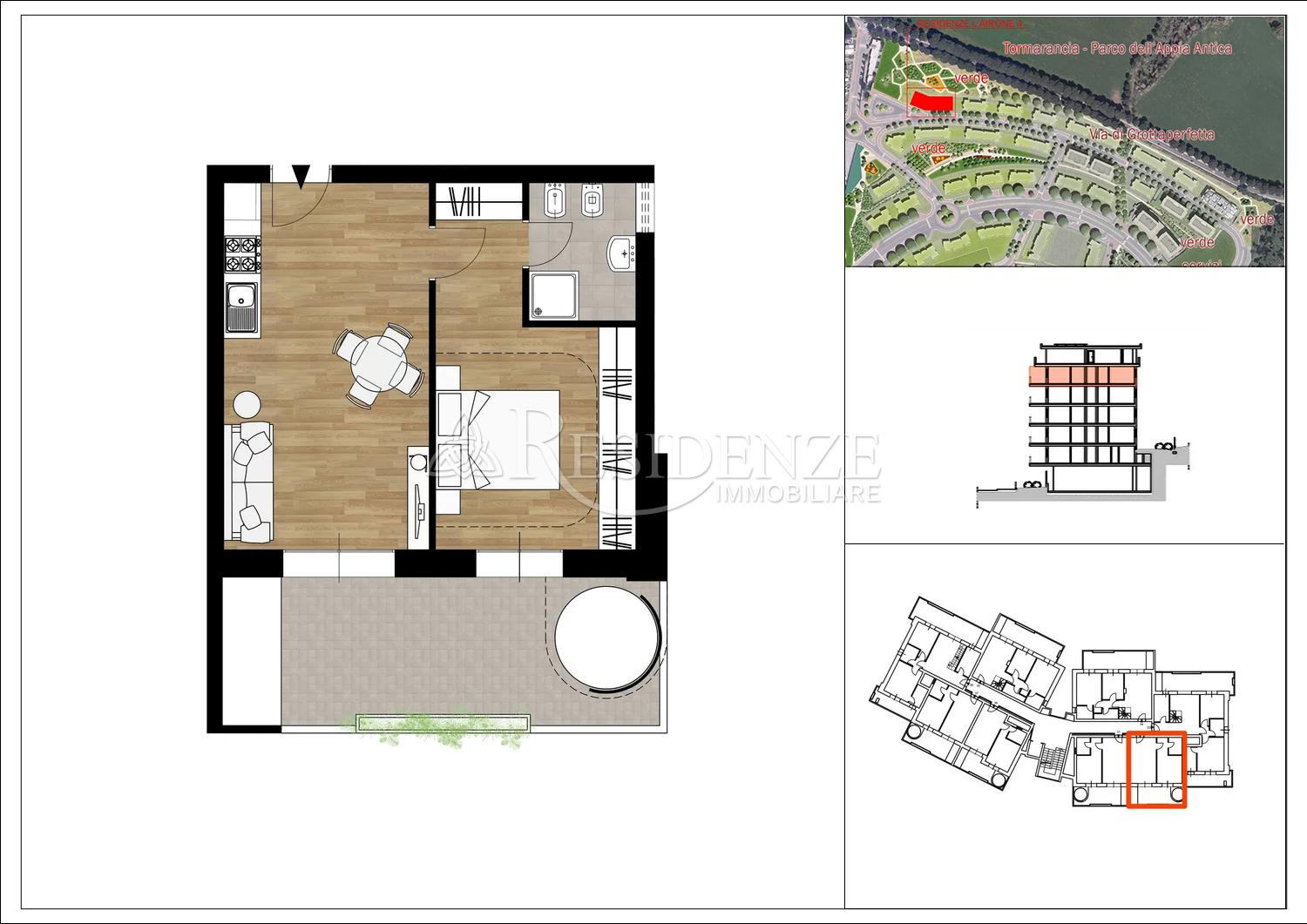 Appartamento, posto al 5° e 6° piano, composto da soggiorno con angolo cottura, camera da letto, bagno e terrazzo; al piano superiore locale tecnico con lavatoio e ulteriore terrazzo.