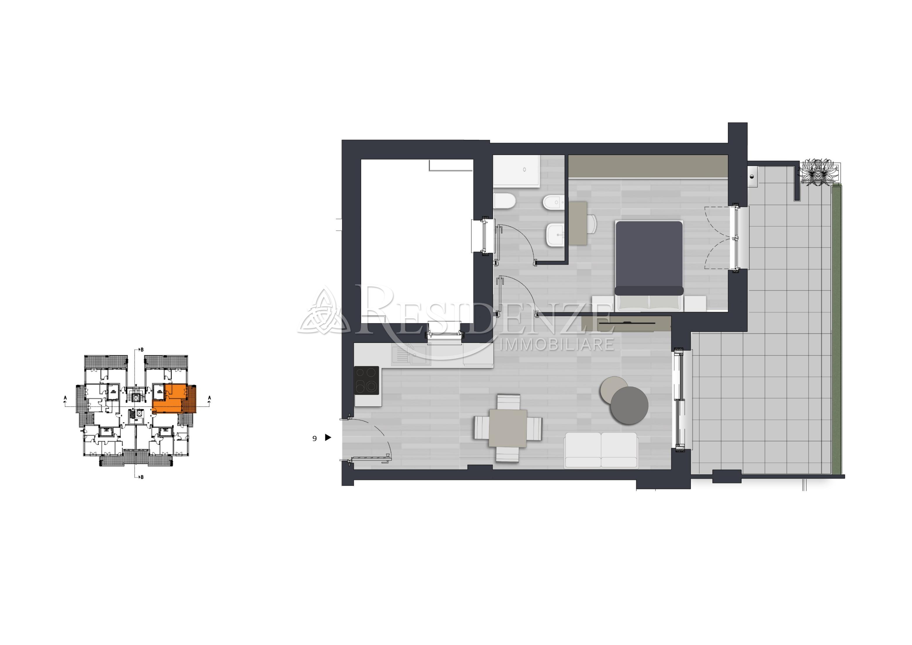Composizione: zona living con angolo cottura, camera da letto, bagno e terrazzo di 18 mq.