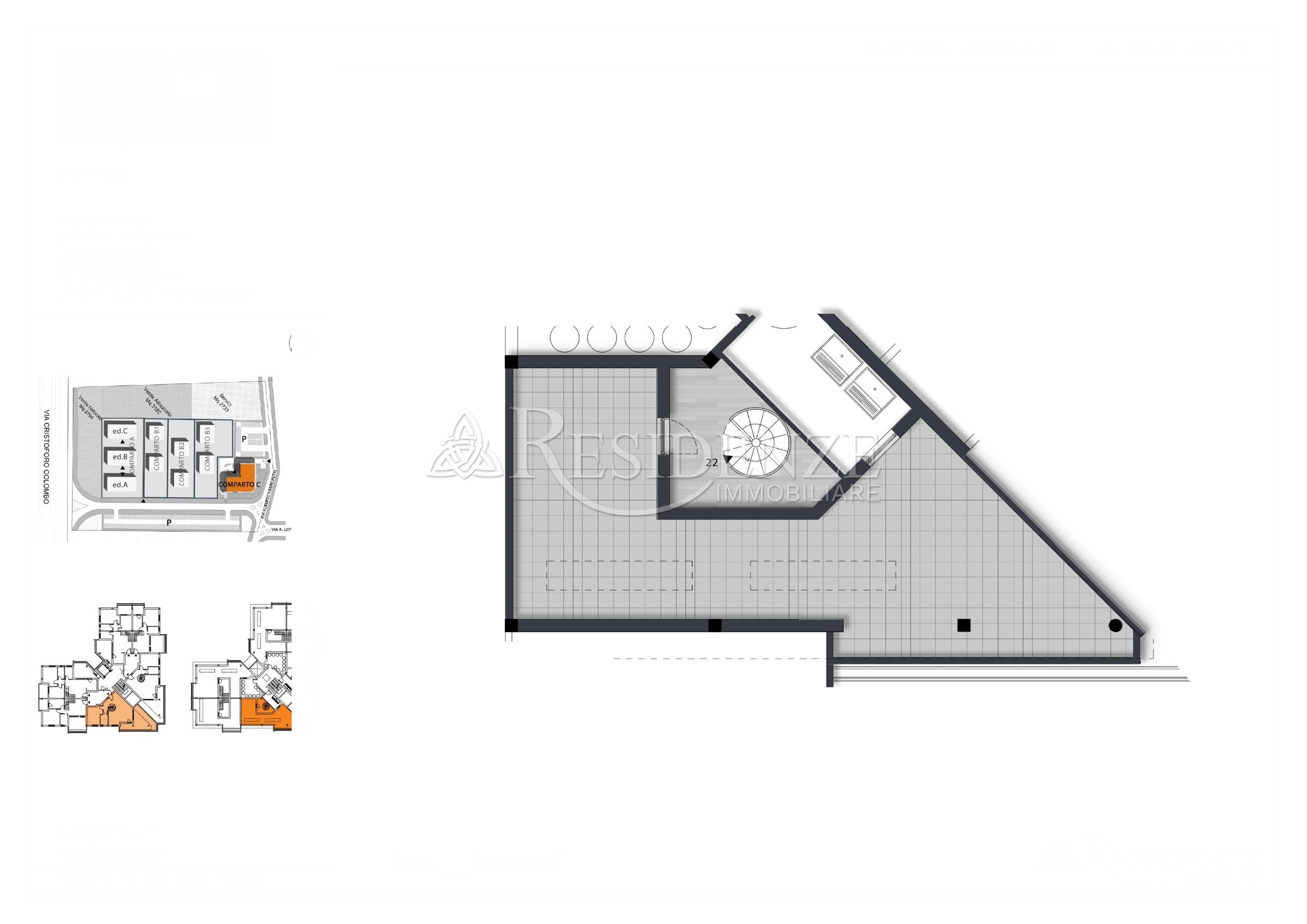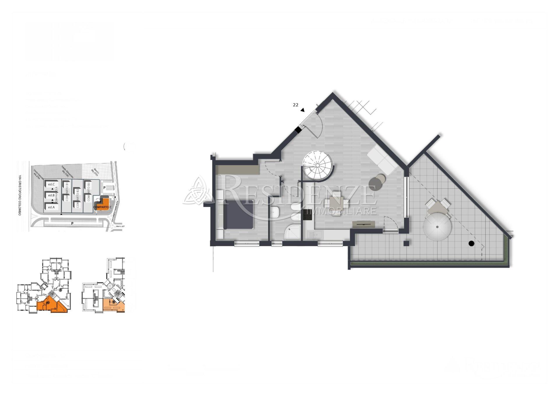 Appartamento bilocale bilivello di 80 mq. coperti posto al piano terzo, composto da soggiorno con angolo cottura, camera, bagno, terrazzo di 31 mq. Al piano superiore un locale e un ampia terrazza di 64 mq. Completa la proprietà un ampio box auto. Superficie commerciale complessiva di 103 mq.