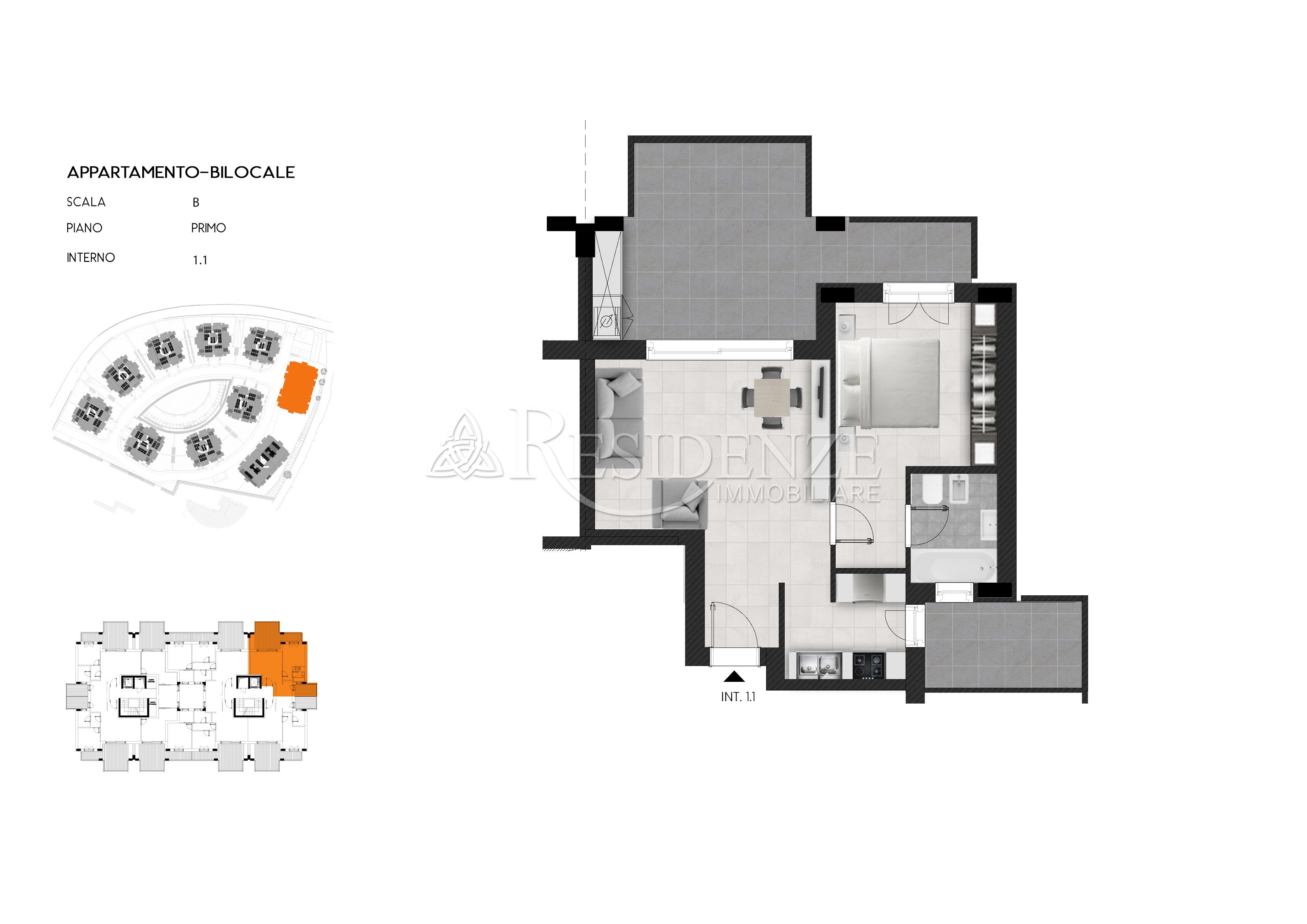 Appartamento bilocale di 60 mq. coperti posto al piano primo composto da soggiorno, cucina, camera da letto, bagno e terrazzo.
