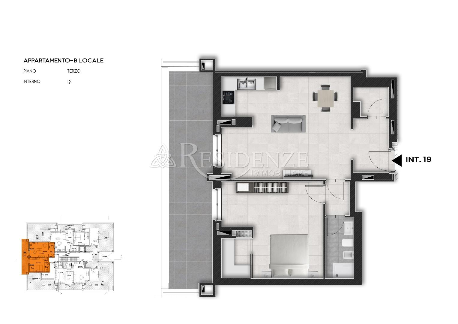 Appartamento bilocale posto al piano terzo di 66 mq. composto da salone con angolo cottura, camera, bagno e terrazzo. Completano la proprietà un posto auto coperto e una cantina. Superficie commerciale complessiva di 77 mq