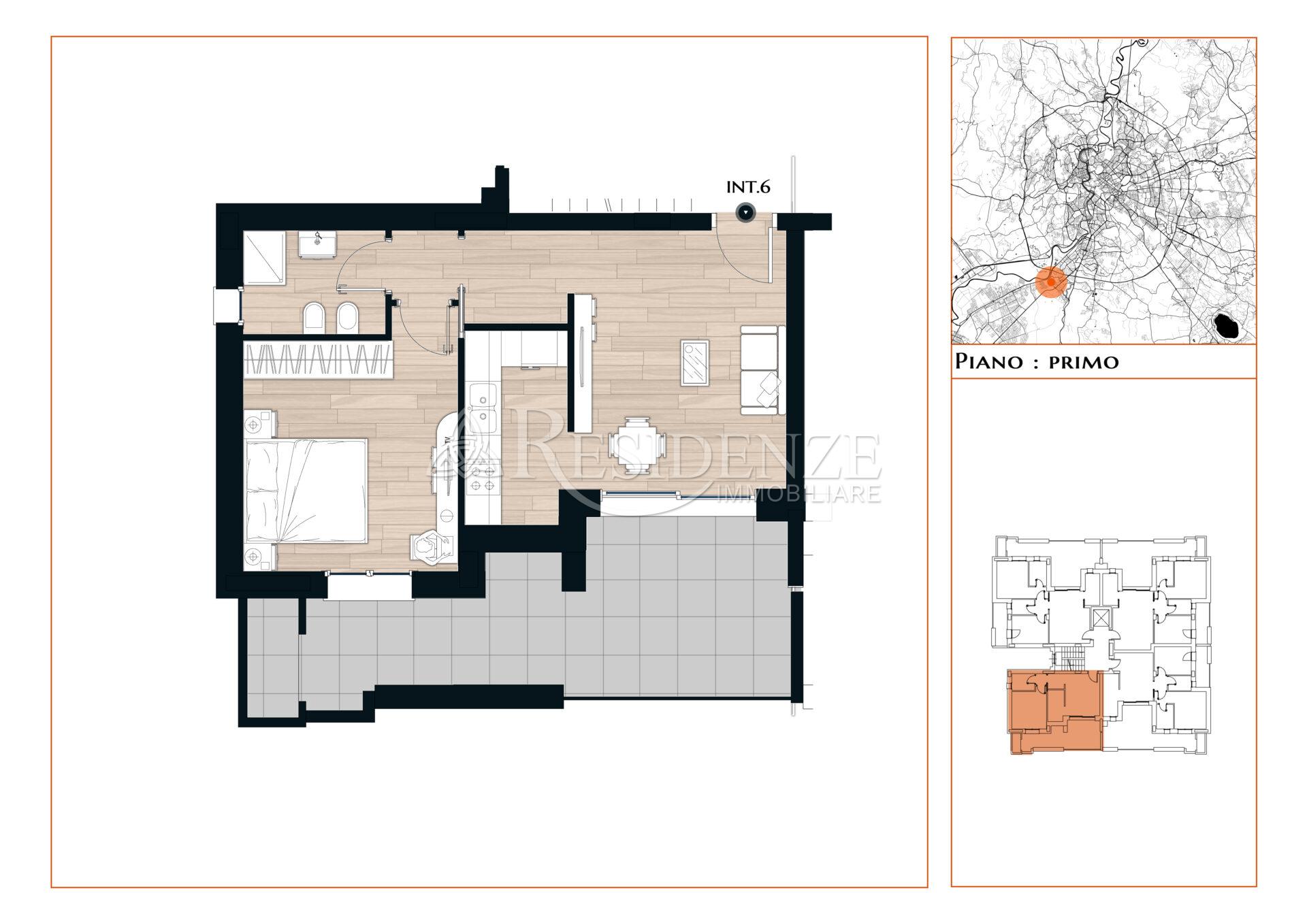 Bilocale posto al primo piano di 59 mq composto da soggiorno, cucina, camera da letto, bagno e ampio terrazzo di 22 mq.