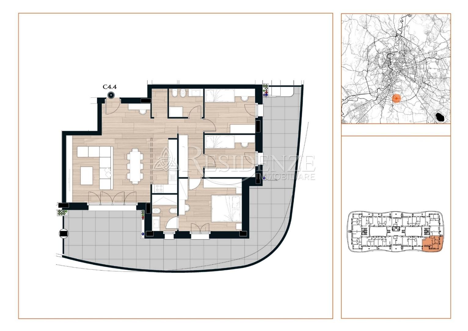 L'appartamento è composto da una zona living con angolo cottura, 3 camere da letto, 2 bagni e un ampio terrazzo di 60 mq.