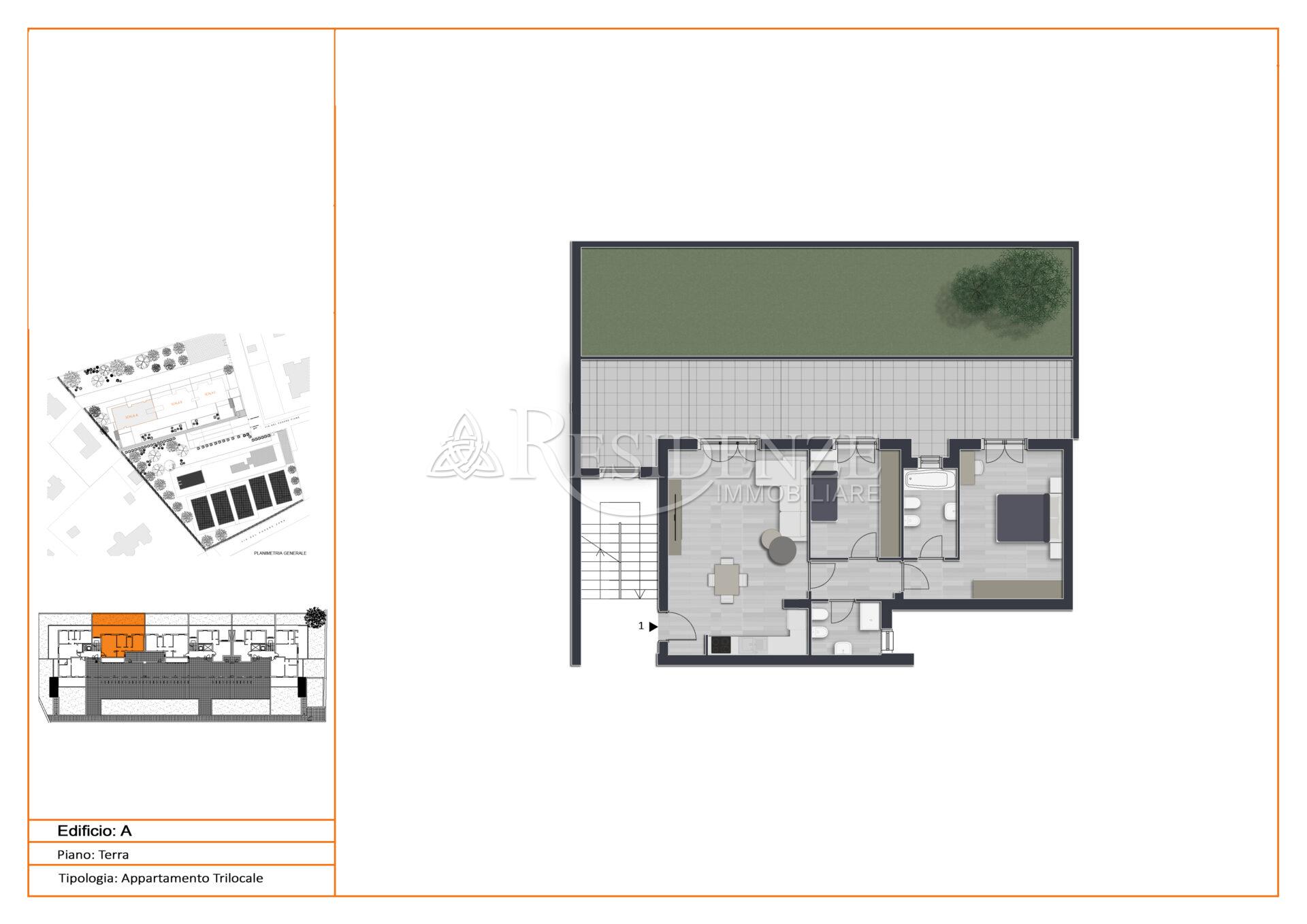Appartamento trilocale di 84 mq posto al piano terra composto da soggiorno con angolo cottura, due camere da letto, due bagni, giardino di 59 mq e portico di 46 mq. Completa la proprietà una cantina. Superficie commerciale complessiva di 103 mq.
