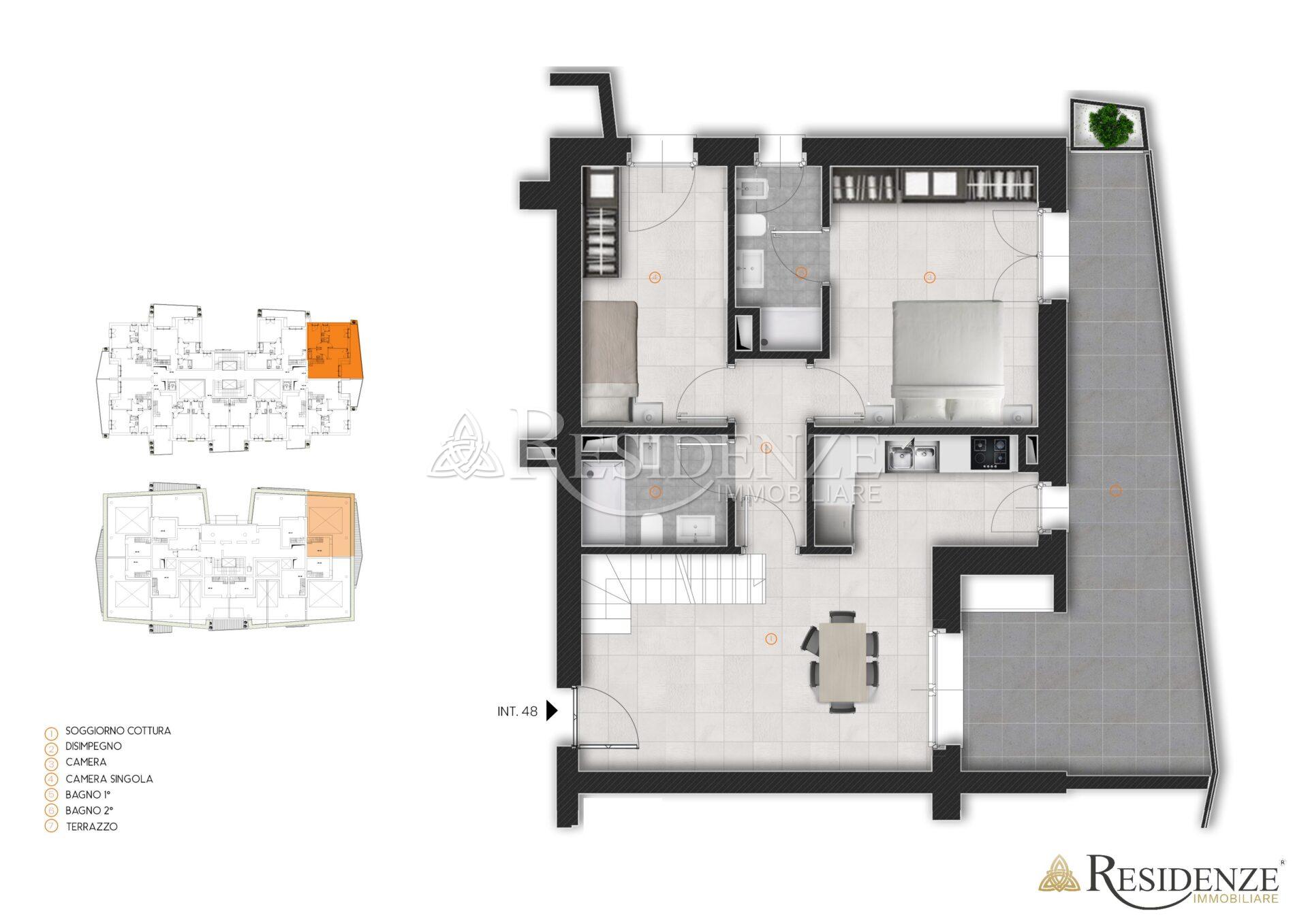Appartamento di 74 mq coperti posto al piano quinto, composto da soggiorno con angolo cottura, due camere, due bagni e terrazzo di 26 mq.
