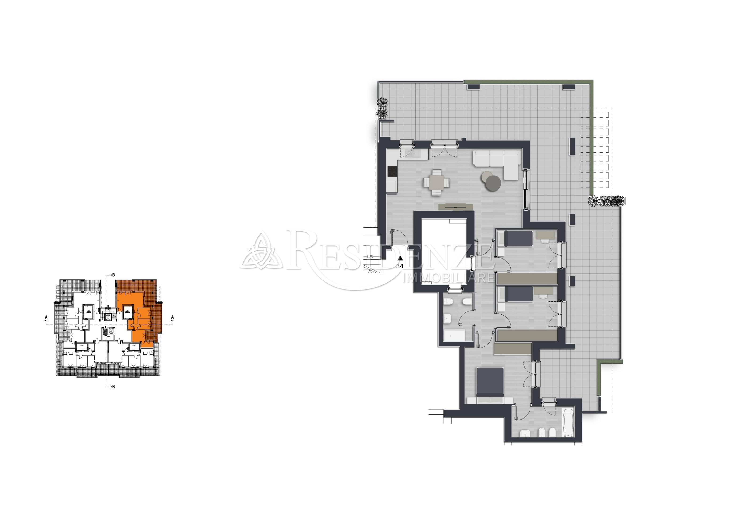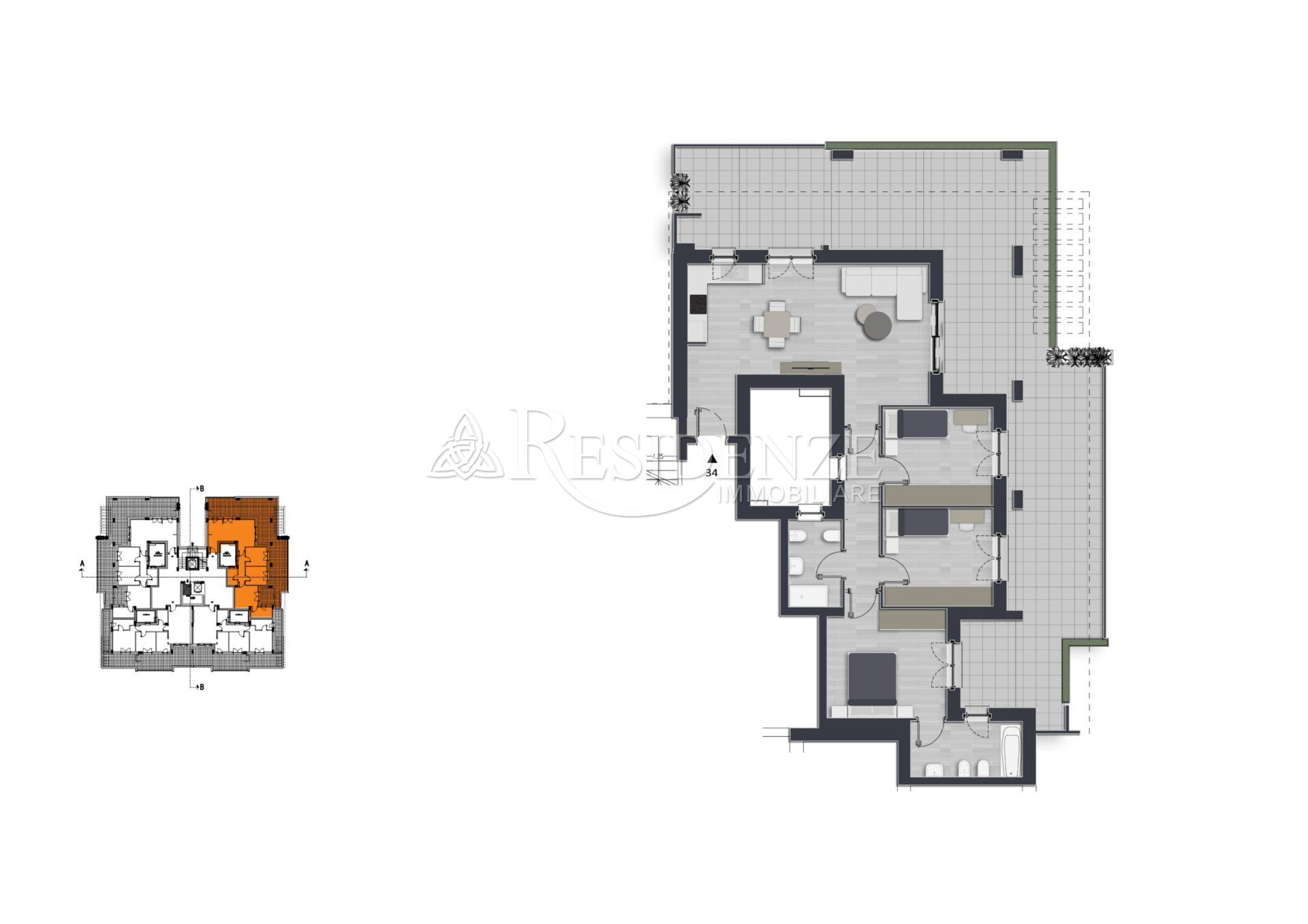 Composizione: zona living con angolo cottura, tre camere da letto, due bagni e terrazzo di 97 mq.