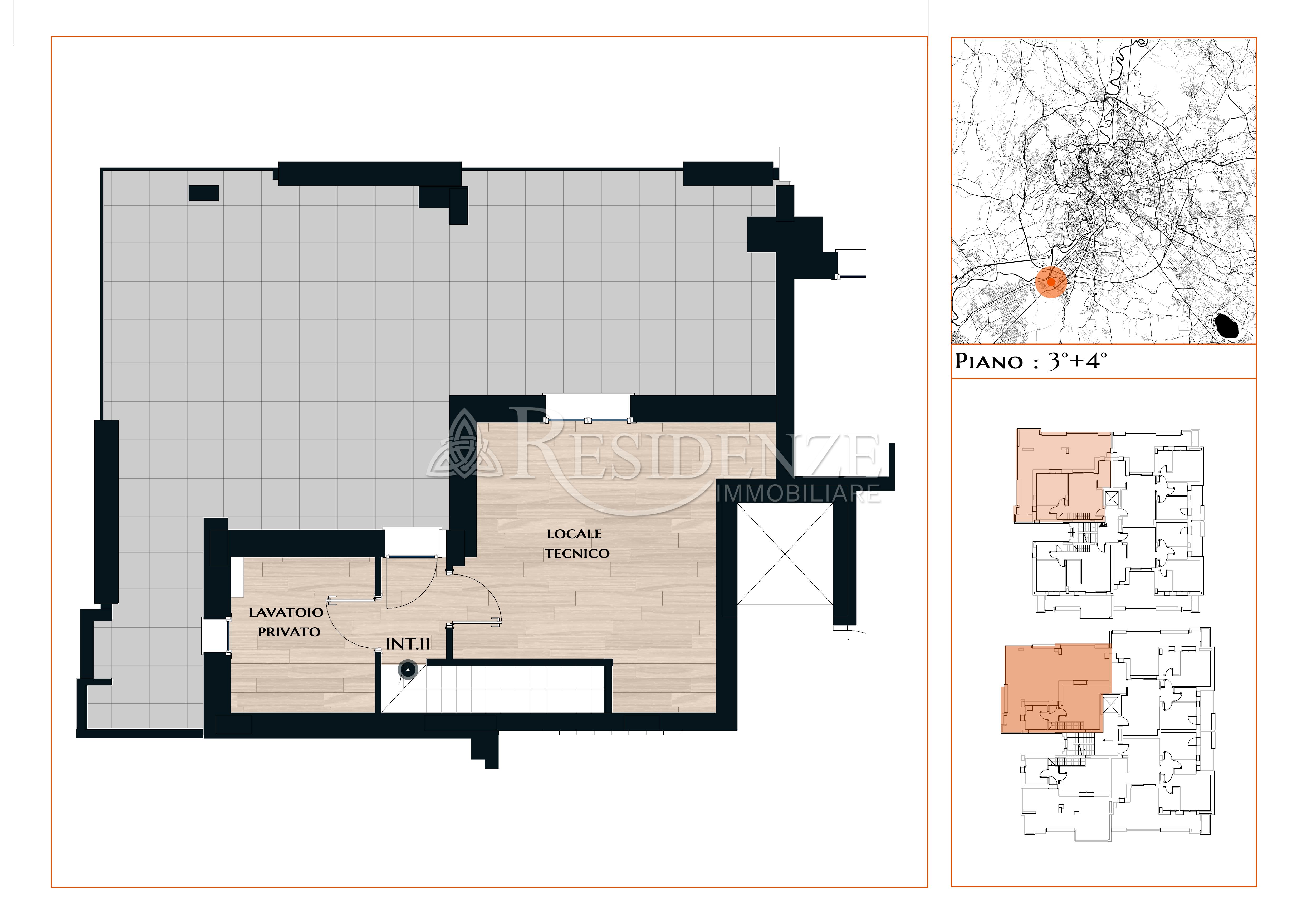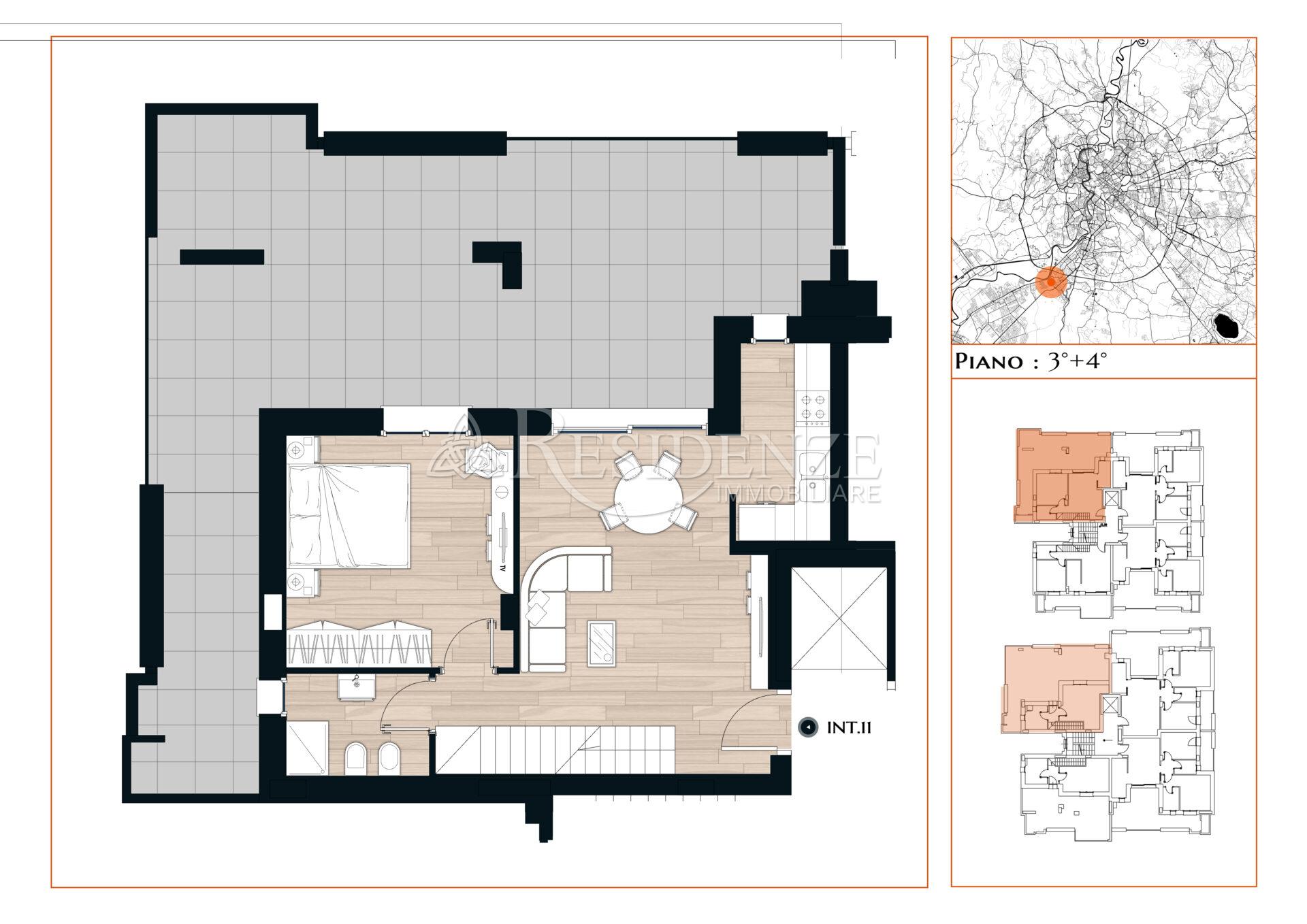 Trilocale bilivello posto al terzo e quarto piano di 107 mq coperti composto da soggiorno, cucina, camera da letto, bagno e un ampio terrazzo di 61 mq. Al piano superiore due locali e un ampio terrazzo di 63 mq