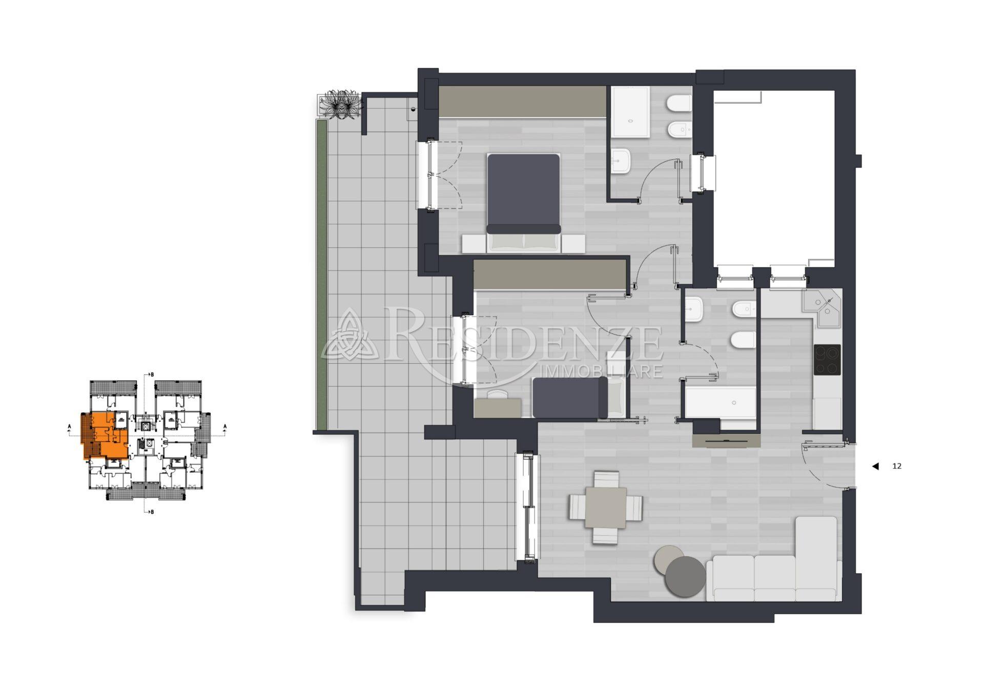 Composizione: zona living, cucina, due camere da letto, due bagni e terrazzo di 30 mq