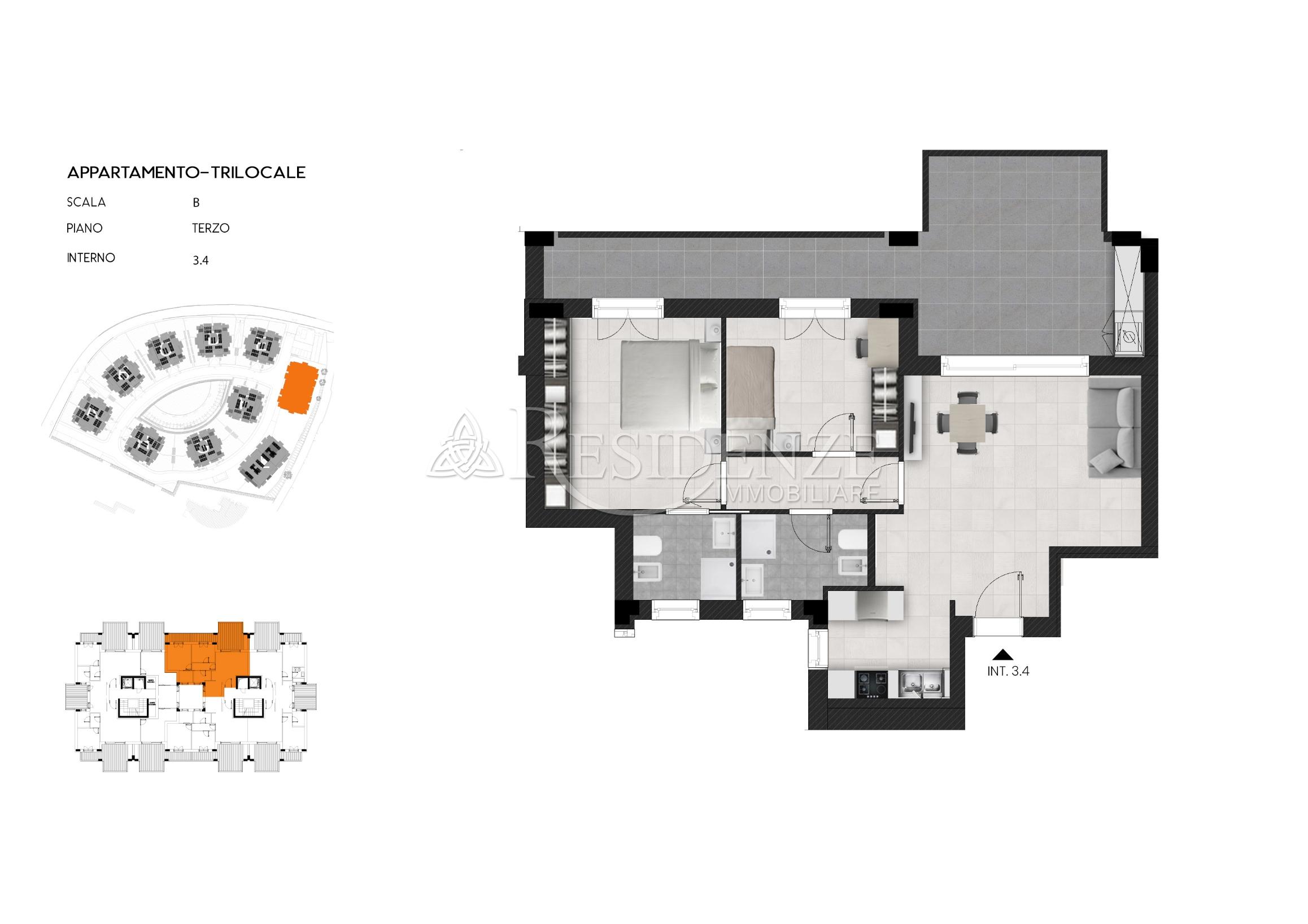 Appartamento trilocale posto al piano primo composto da soggiorno, cucina, due camere da letto, due bagni e terrazzo.