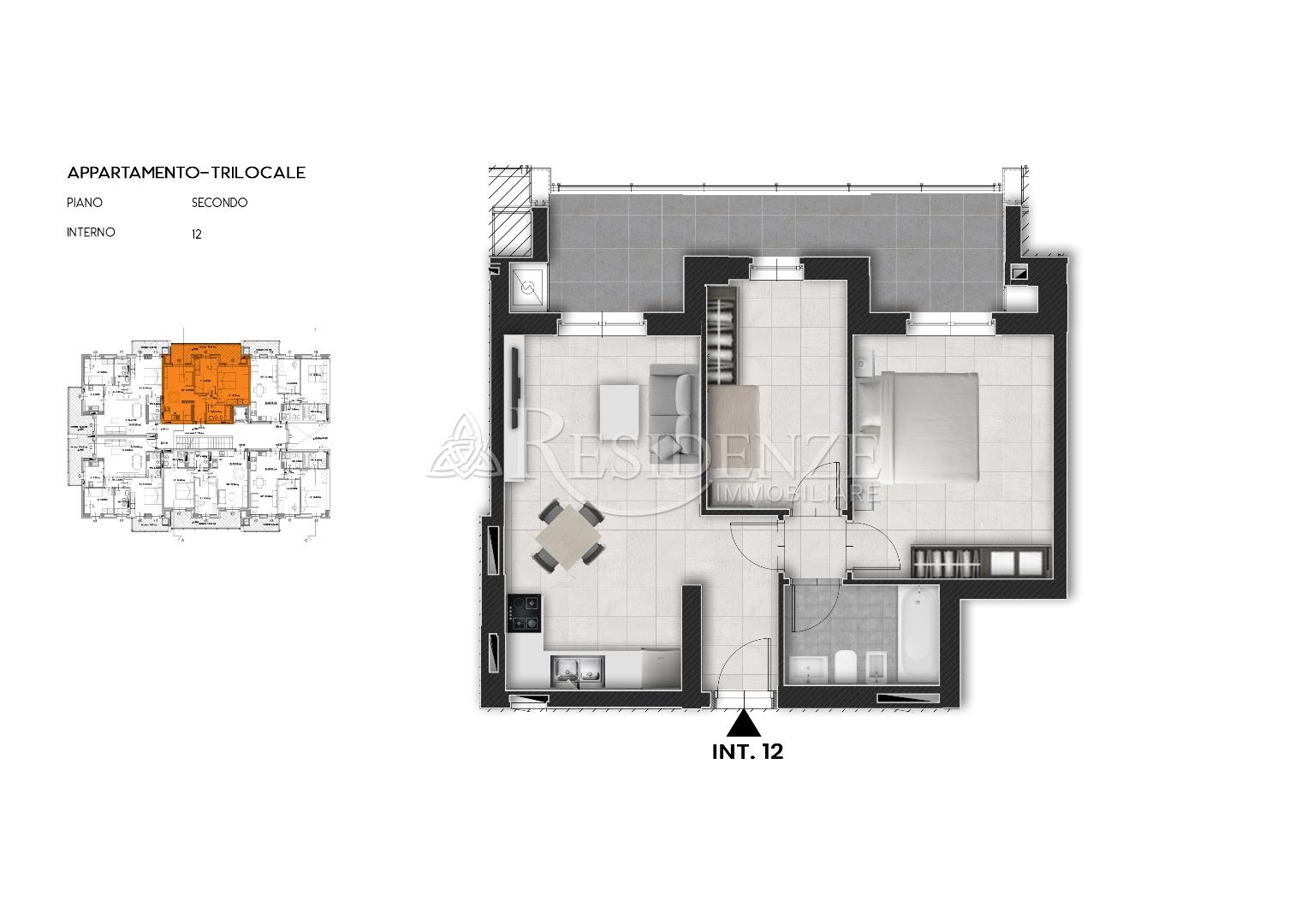 Appartamento trilocale posto al piano secondo di 60 mq coperti composto da salone con angolo cottura, due camere, un bagno, un balcone di 14 mq. Completano la proprietà un posto auto coperto e una cantina. Superficie commerciale complessiva di 69 mq