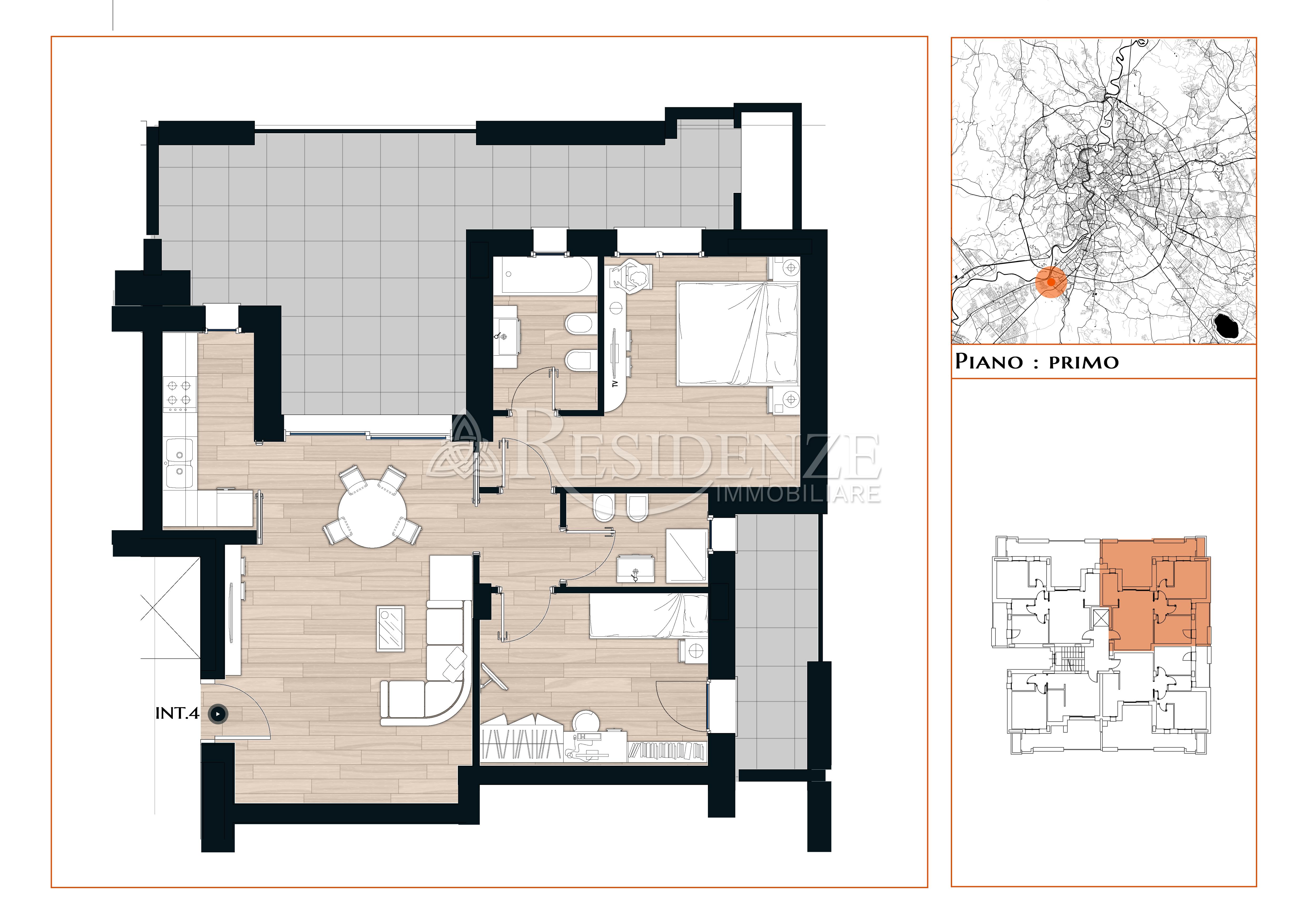 Trilocale posto al primo piano di 83 mq coperti composto da soggiorno, cucina, due camere da letto, due bagni e un ampio terrazzo di 37 mq.
