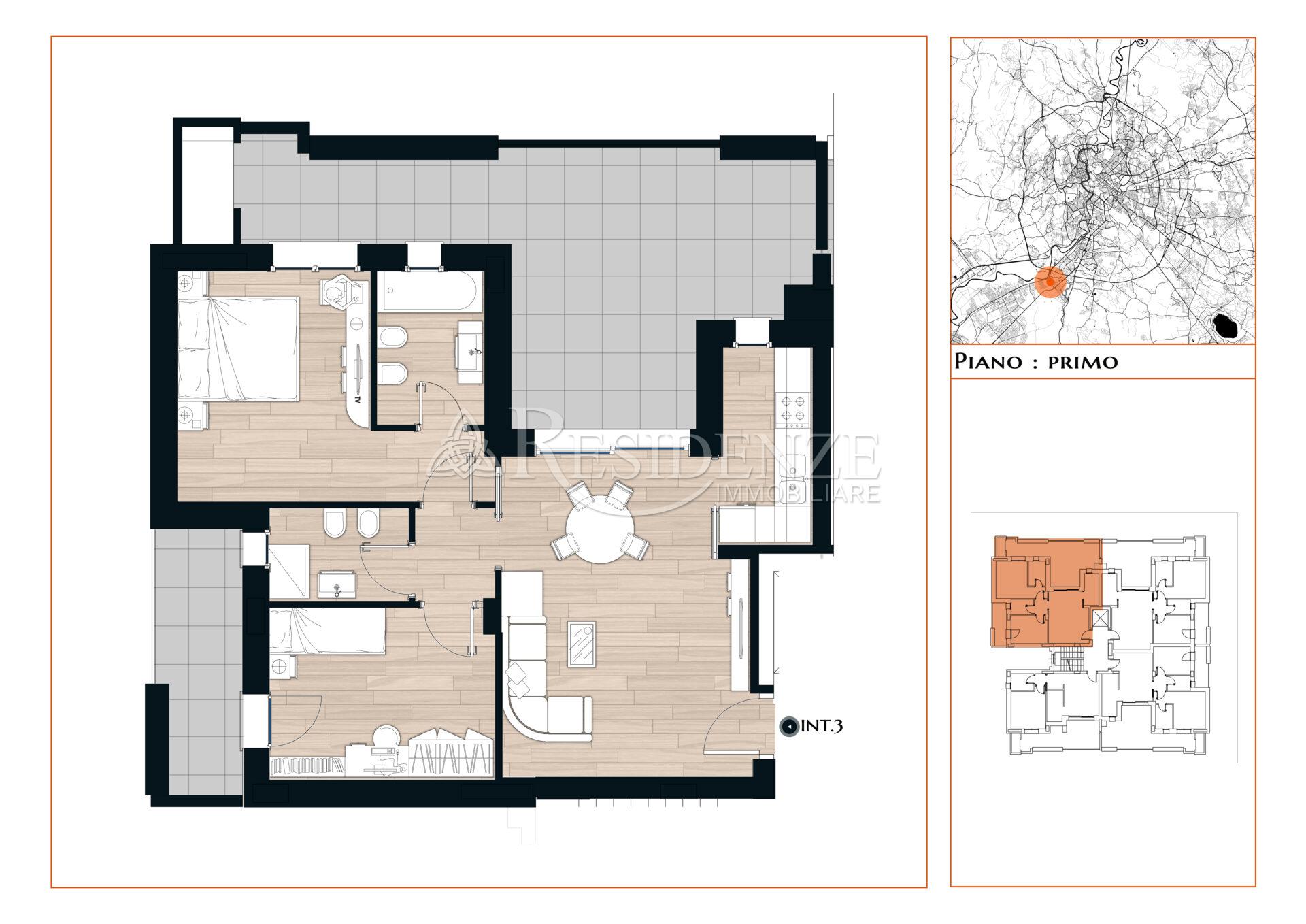 Trilocale posto al primo piano di 83 mq coperti composto da soggiorno, cucina, due camere da letto, due bagni e un ampio terrazzo di 37 mq.