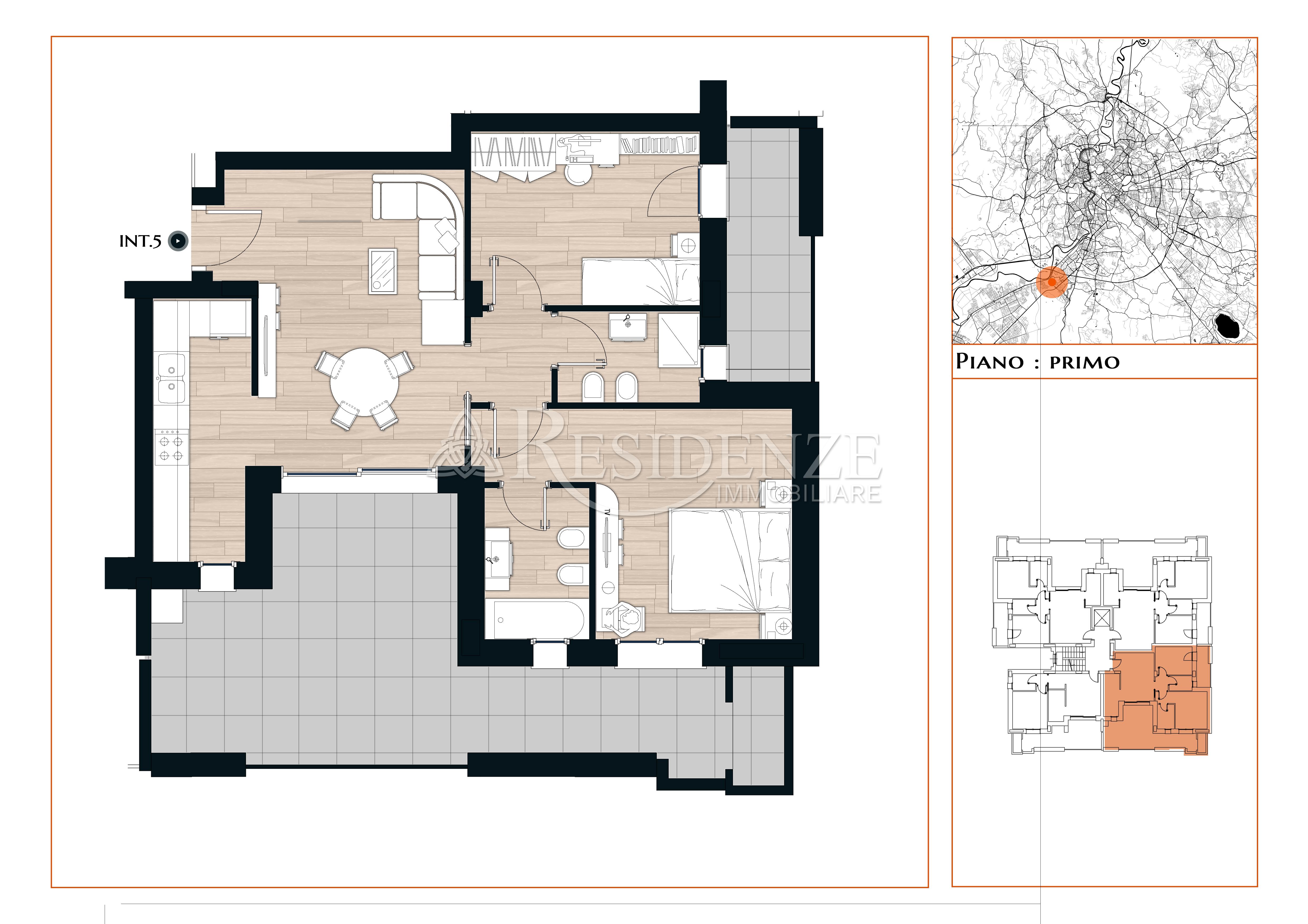 Trilocale posto al primo piano di 79 mq coperti composto da soggiorno, cucina, due camere da letto, due bagni e un ampio terrazzo vivibile di 37 mq.
