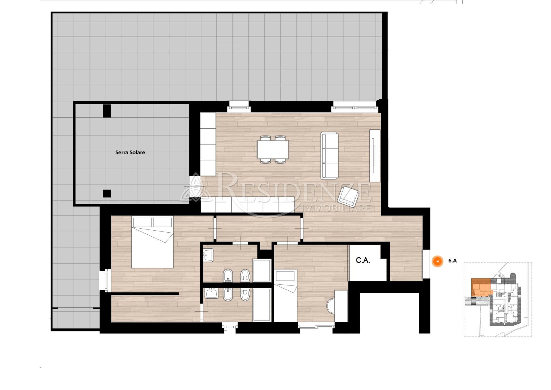 Appartamento trilocale posto al primo piano di 86 mq coperti composto da soggiorno con angolo cottura, due camere da letto, due bagni, serra solare di circa 17 mq e un grande terrazzo di 55 mq. Superficie commerciale complessiva di 118 mq