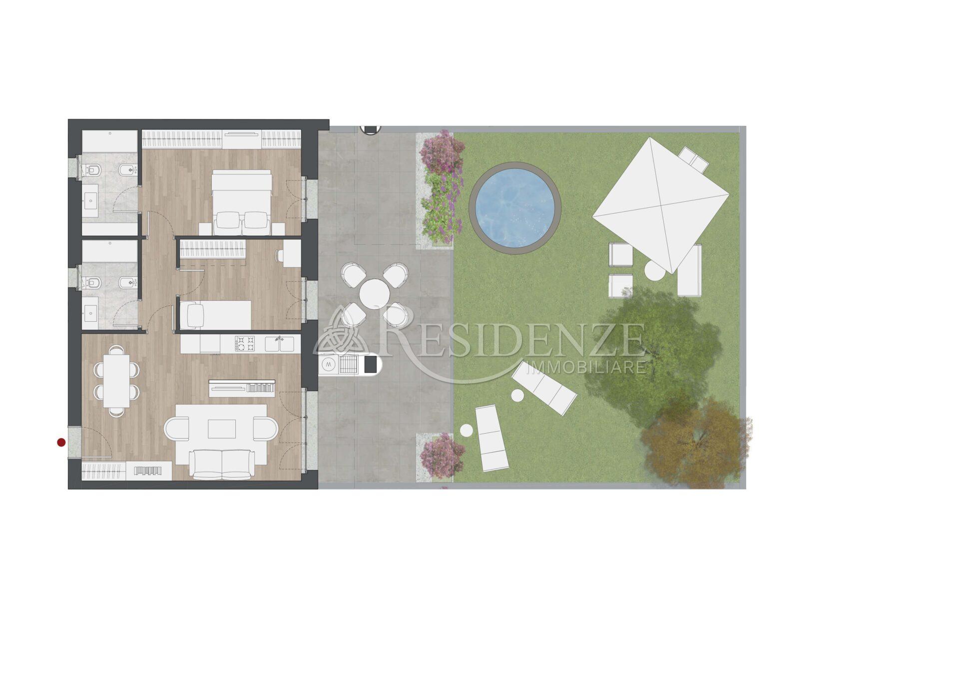 L'appartamento è composto da una zona living con angolo cottura, due camere da letto, due bagni, portico con giardino che completa la proprietà.