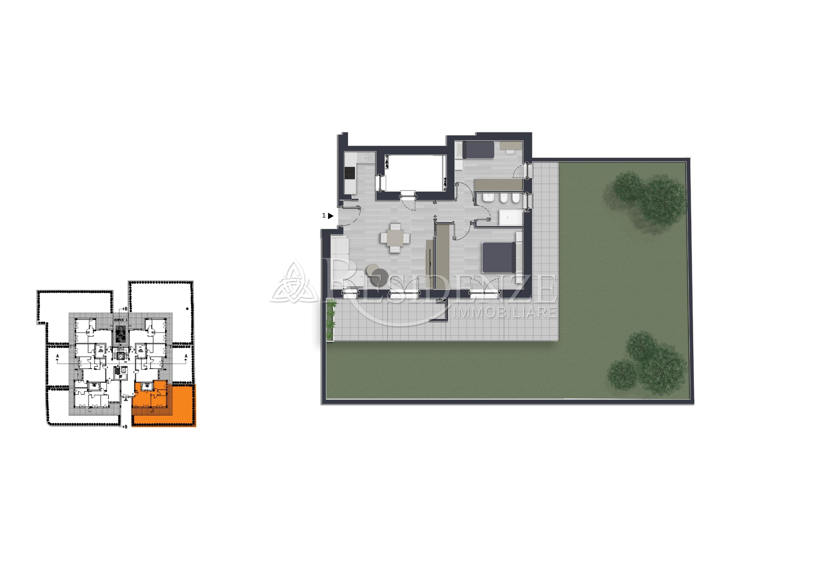 Composizione: zona living con angolo cottura, due camere da letto, bagno, portico di 36 mq. e giardino di 147 mq.