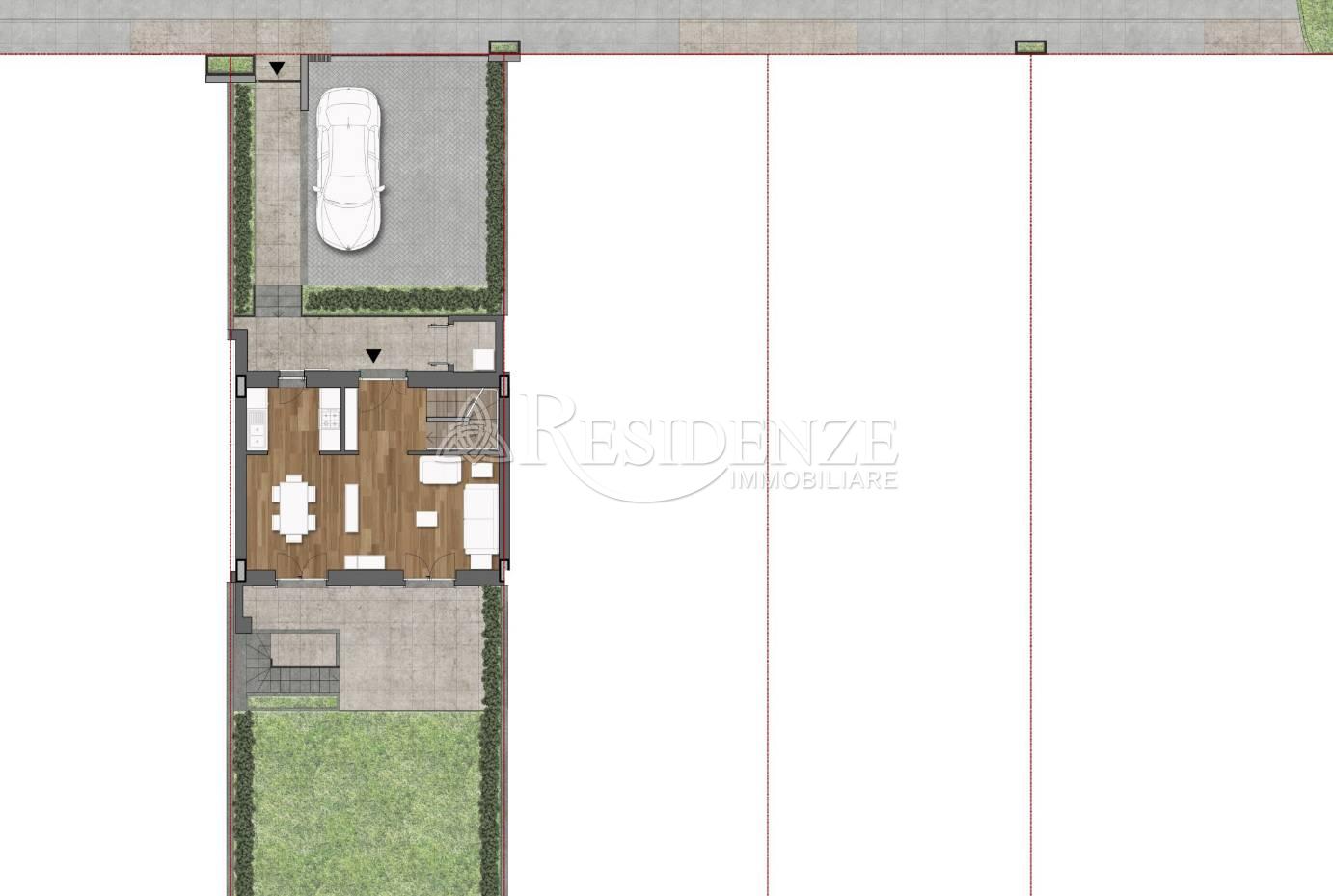 Villa a schiera distribuita su tre livelli, con giardino privato, corte pavimentata e comodi spazi interni.